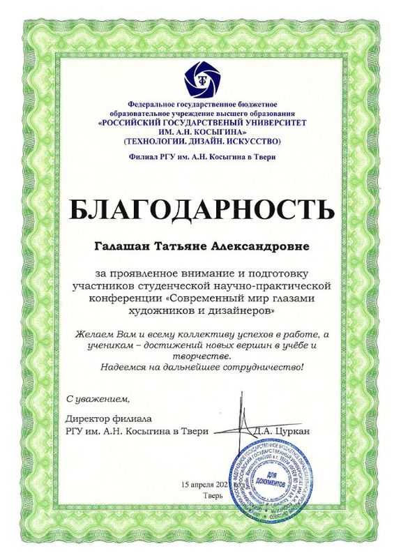 15 апреля 2021 г. сотрудники и ученики нашей школы приняли участие в НАУЧНО-ПРАКТИЧЕСКОЙ КОНФЕРЕНЦИИ "СОВРЕМЕННЫЙ МИР ГЛАЗАМИ ХУДОЖНИКОВ И ДИЗАЙНЕРОВ", которая проходила на базе филиала ФГБО ВО "РОССИЙСКИЙ ГОСУДАРСТВЕННЫЙ УНИВЕРСИТЕТ ИМ. А.Н. КОСЫГИНА" г. Тверь.